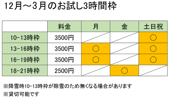 ・2026年冬季は全て3時間枠で営業、価格据え置き